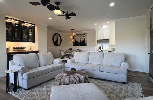 The oversized welcoming living room includes a 3 cushion couch, a loveseat and a large, plush double seat chair with ottoman, plus the added sophistication of a bar with a wine fridge.