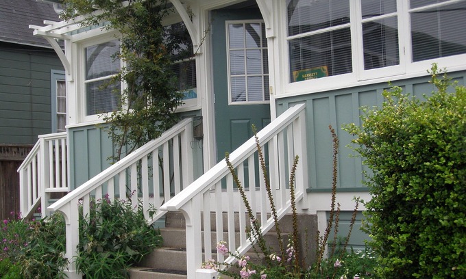 The cottage has 7 steps from the curb to the front door and a slight, 4" rise from the sun room into the living room. The glass-enclosed, shower over tub has one grab bar. Our Pacific Grove License is 0020.