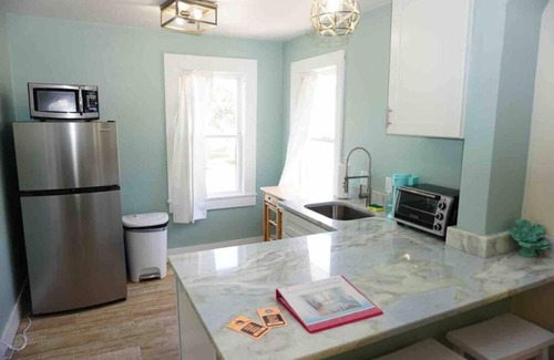 Private SECOND FLOOR 500 sq ft apartment with a fully stocked kitchen. There is a portable 2 burner cooktop, toaster oven, coffee maker, and all utensils and cookware needed for a great meal! Everything is new at this fully renovated apartment!