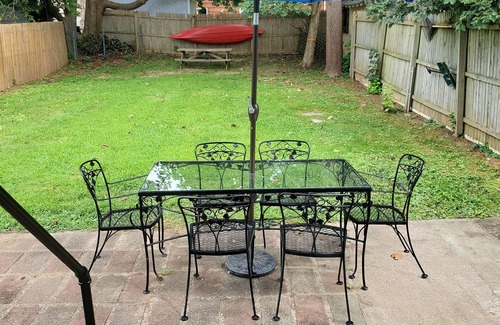 OUTDOOR LIVING: Patio table and chairs for 6. Folding wagon to take to beach, beach towels.