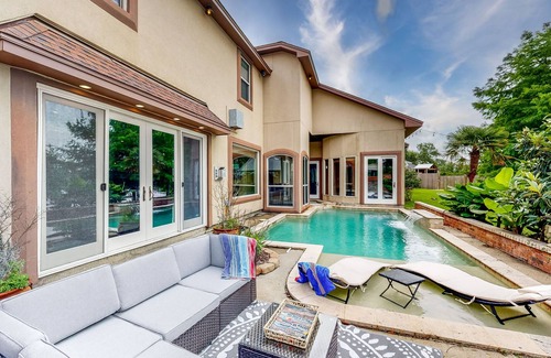 Follow the Texas sun and you'll end up at Stillwaters Paradise, a stunning waterfront home on Cow Bayou, boasting a private pool and panoramic views. Feel like you're at your own private resort when you hang out by the heated pool with a waterfall, in the spa-like jacuzzi, or on the large patio. When you aren't dipping into the turquoise waters, enjoy effortless fishing and boating access.