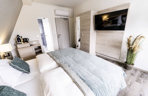 Jedes unserer Pensionszimmer bietet ausreichend Staumöglichkeiten für Ihr Gepäck, sodass Sie sich bequem ausbreiten können und sich wie zuhause fühlen. Die hochwertigen Betten sind bereits bezogen und bieten Ihnen einen erholsamen Schlaf auf sehr guten Matratzen. Zur Entspannung nach einem langen Tag steht Ihnen ein TV zur Verfügung. Damit Sie auch während Ihres Aufenthalts immer in Verbindung bleiben können, bieten wir Ihnen WLAN in allen Zimmern. Zur Zubereitung von Kaffee oder Tee steht Ihnen eine Minibar und eine Caffisimo Kaffee-Maschine mit verschiedenen Kaffee- und Teesorten zur Verfügung. In der Minibar befinden sich kühle Getränke und kleine Snacks (wird separat abgerechnet). Unsere Badezimmer sind mit Stauraum, Dusche, WC, Fön und Handtüchern ausgestattet und bieten Ihnen alles, was Sie für eine angenehme Auszeit benötigen. Damit Sie eine kühlen Kopf bewahren, ist kostenlos eine Klimaanlage vorhanden.