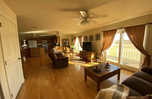 This “house” is attached to the back of our three car garage. It has its own deck on the back with access to a grill and gas fire pit upon request. The inside has an “open-floor concept” with the kitchen, dining, and living room combined. There’s a master bedroom with laundry on the first floor, along with a large, handicapped accessible bathroom. Upstairs is another huge living room/playroom for the kids or second couple. There are twin beds, games, books, and another large bathroom! There’s also a queen size sleeper sofa, with a memory foam mattress topper to put on it for additional comfort.