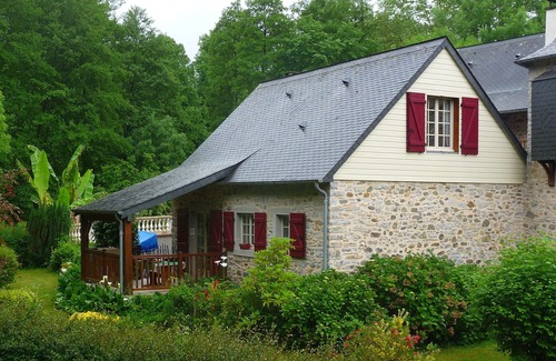 5 minutes from OLORON SAINTE MARIE at the entrance to the Aspe Valley, the mill of Eysus, majestic Béarnaise residence bathed in lush greenery and white water offers the "GÎTE DE PONTRES" fully restored, facing the old bridge built under Louis XV, obligatory passage of the pilgrims of Saint Jacques. Bordered by a stream flowing right in front of the terrace, you will enjoy a calm and peaceful environment.