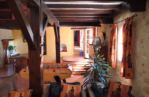 (Text automatically translated) Renovated farmhouse with charm of stone and modern facilities on garden of 3000 m2 with a swimming pool heated between 29 and 33 ° C from April to November, protected by a low enclosure motorized retractable. In the heart of the vineyards of Fronsac, near Bordeaux and St Emilion. At 1:15 the beaches of the Atlantic: Royan, Arcachon, Lacanau. Description of the house: a first part with one bedroom and a 160x200 bed with dressing room of 7m2, shower room and separate WC. Upstairs, access is via a steep staircase, a game room with TV, video game, game, library, mini football, mini billiards A bed sofa bed with a good sleeping 2 pull-out beds. A central part of 70m2 with lounge, TV and large open fireplace, a dining room and lounge with bar.Mezzanine computer and library. A third party with kitchen and fireplace fermée.A floor: bedroom with 140x190 bed in mezzanine, a bedroom with a bed of 140x190, a small room with a bed of 140x190. A separate toilet and a bathroom with bath, double sink and toilet. Our cat is very independent but it may enter the house.