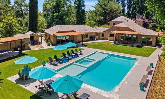 Stone River Retreat is nestled along the banks of the Mokelumne. Six spacious bedrooms (3 downstairs and 3 upstairs) 4-1/2 bathrooms. Sleeps 14. Heated sport pool/spa (27'x40'), over 1,000 sq ft of covered patios for lounging, ping-pong, lawn games,dining and other entertaining.