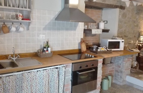 Casa Il Nido is the smallest of four apartments on the property. It is equipped with modern kitchen and bathroom equipment along with stone floors and walls, lace curtains and antiques. The view from the windows and the door is beautiful, and overlooks the ancient bell tower of the village and the nearby mountains.