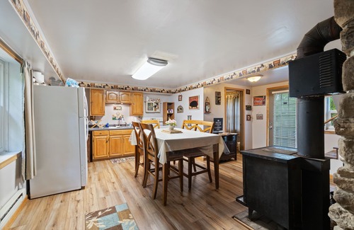 The great room is very large with cathedral ceilings and plenty of space for the guests to spread out. There are many skylights and windows to let in the natural light and the beautiful wooded scenery. There is a stone fireplace in the great room and a wood burning stove. All of the firewood is included. There is a full kitchen including all major appliances, cooking utensils, and a dining table.