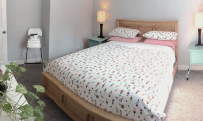 This cozy garden-level 1-bedroom suite is perfect for couples or solo travelers seeking a perfect getaway. The bedroom features a Queen-sized bed, adorned with inviting duvets and plush pillows, ensuring a restful night’s sleep. The fully equipped kitchen with counter seating provides all the essentials for a home-like experience, while the comfortable living room, furnished with cozy seating and a smart TV, offers a relaxing space to unwind. Stream your favorite shows or explore local cable channels with ease. The bathroom includes a tub and shower, stocked with body wash, shampoo, conditioner, a hair dryer, and plenty of fresh towels.