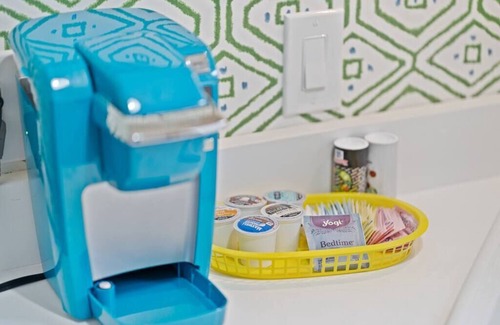 Lovely kitchenette with microwave, fridge, coffee maker + kitchen amenities plus a cute dining corner.