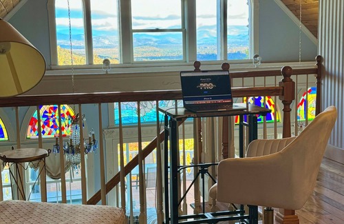 As you step inside, you'll be greeted by the rustic charm of the stone architecture, complemented by custom stained glass accents throughout the home. The main level features a cozy living area with a wood-burning fireplace, perfect for gathering around on chilly evenings. Admire the stunning vistas of Mount Washington through the large windows while you relax in comfort.