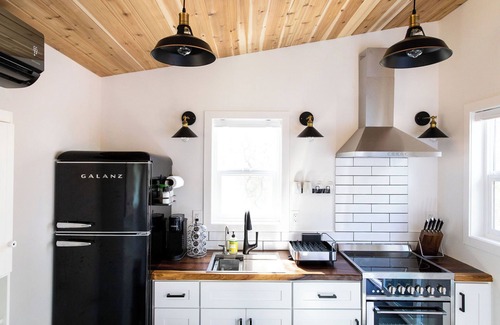 The cabin can accommodate 3, but more comfortable with 2-3 as we have a queen bed in the loft, and a small pull out sleeper sofa down below for 1+. The cabin and kitchen pod are separate buildings connected by a wrap around deck as your outdoor dining space. The kitchen pod is fully setup to bring your culinary dreams to life.