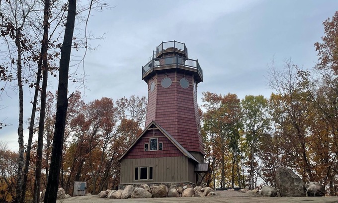 The lighthouse is located on 50 acres of wooded property on Rock Lake in central Minnesota (about 2 hours northwest of the twin cities). The 2,000 square foot lighthouse has seven levels, including the crows nest that is over 50 feet high, here guests can see over the canopy of the trees. It is a timber framed structure that includes 3 bedrooms and 3 bathrooms.