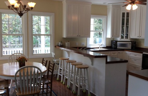 This 5 bedroom, 3 1/2 bath home is located on the intra-coastal waterway, in a quiet gated community, 20 minutes from Historic downtown Charleston. This house, surrounded by live oaks, offers a relaxing Southern atmosphere. The wrap-around porch offers a variety of natural views. This 3 story home has elevator access to each floor. The top floor has 3 bedrooms with queen beds and an open bonus room with a double bed. The main floor boasts a large family room, a kitchen, and a dining room overlooking the Stono river. Just off the family room is the master suite with a king bed and a private bath with an antique claw foot tub and separate walk in shower. There is also a double bed located off the kitchen with a connecting half bath. This river home sleeps 10 to 12 people comfortably and is ideal for connecting with nature and relaxing. There is an elevator for luggage and ease of getting into the house. However the contractor chose to make the interior doors too small for wheelchairs.
