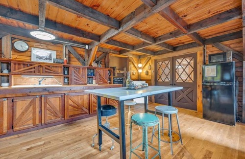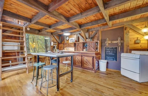 Wake up in the lofted bedroom as the morning sun illuminates the vibrant fall foliage through the apex windows. At night, snuggle up in your king bed and gaze at the starry sky, dreaming of the next day's activities.