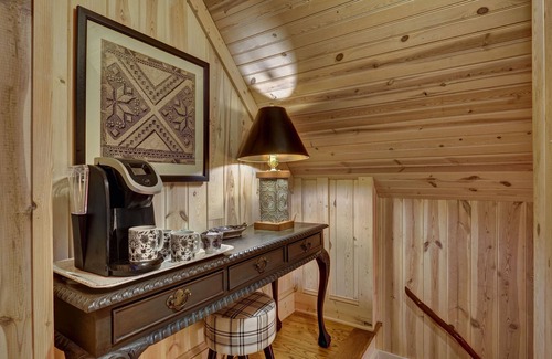 The upstairs master offers a king bed with fireplace, sitting area, flatscreen TV, private coffee station and wooded, lake view.