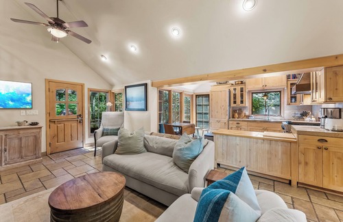 The main cottage is a perfect retreat for 2, but can easily accommodate 4. Two small bedrooms on the main level with the small bathroom in between. The loft with a full bed has curtains that close off for more privacy. The kitchen is a gourmet cook's delight with a Wolf range and a Sub Zero fridge. There is a small leaf table in the kitchen perfect for two and can be opened and pulled away from the wall to fit 4. Warm your toes on the radiant heated stone floors throughout, build a fire in the stone fireplace and soak in the stream-side hot tub. At the end of your day, sink into the comfy beds and luxurious linens that guests rave about. Enjoy sleeping on the soundtrack of the babbling mountain stream that you can hear from every part of the cottage.