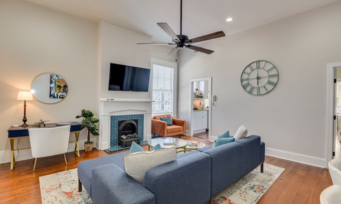 The historic Stovall-Barnes House is a short walk from the Savannah River, the medical district, the Cyber Center, and many of the city's most dynamic entertainment venues, restaurants, and museums. This charming home retained some of the original wood floors, mantels, windows, and moldings and boasts 12' ceilings. The new modern kitchen includes granite countertops and stainless steel appliances. Includes stackable w/d, smart TVs, wifi, plush linens, and gated off-street parking. When you enter the gated parking area in the back of the home, you will see a beautiful outdoor common space that has a masonry fireplace, a gas grill and a covered seating area. When you enter the back door of the building, you come into a grand common foyer with a beautiful, original staircase. The foyer gives way to 4 individual private apartment units that are completely separated from each other. Each unit hosts it's own living space, kitchen and bedroom(s) and bathroom(s). This unit is in a building with other VRBO listings. If you are in search of a place to house a large group for a wedding, girls weekend, family reunion or business function, this is an excellent choice. Each unit, however, is it's own separate apartment that is completely private from the other units. Message us for more details and receive the link to book directly. Please also note, this home is located in the downtown environment and there will often be noise from a neighboring bar, trains and traffic.