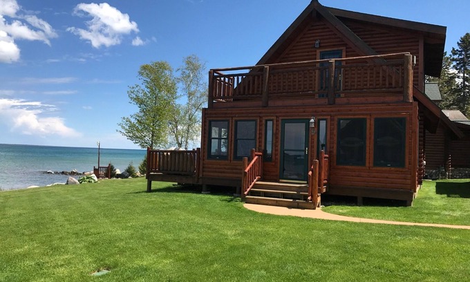 Immaculate 2 bedroom log cabin located directly on the Straits of Mackinac sleeps 5.