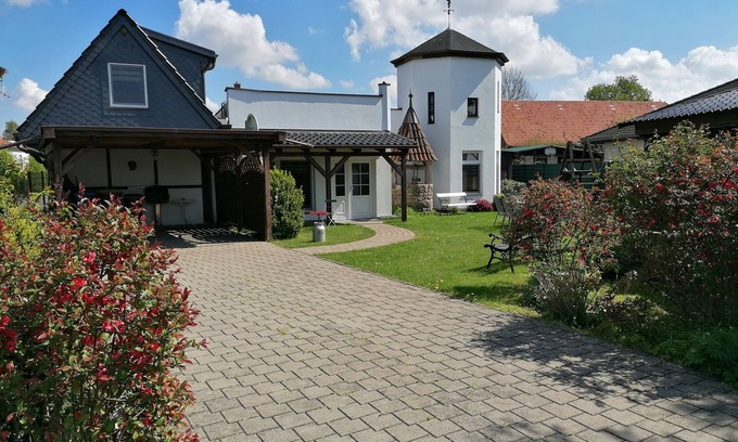 The upper floor of the half-timbered house offers a wide view of the field meadow opposite and magnificent sunsets. A huge, invisible roof terrace with panoramic views and green roofs (new!) invites you to relax and sunbathe. The garden offers opportunities for playing (play house with slide, swing, sandpit with toys), sunbathing and relaxing and for cozy barbecues. There is also an outdoor sauna. The house is lovingly, comfortably and well furnished. 4 cars can be parked comfortably on the property. Two electric gates provide security and enable easy access by remote control. A carport provides storage space.