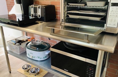 Not quite a full but more than a utility, kitchen. Full fridge/freezer, 2 burner induction cooktop, an XL oven/toaster oven for all of your baking needs, a large microwave/air fryer combo unit, toaster, crock pot and Keurig.