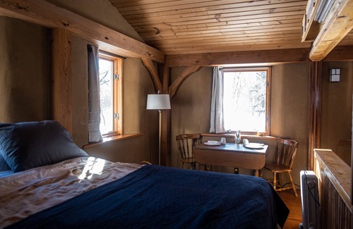 This straw-clay "cabin" is sort of set up like a studio with an open floor plan. It's ideal for couples looking to get away and stoke the fire of their relationship, but if three close freinds want an affordable escape, there is plenty of room!