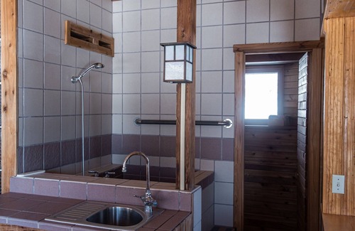 A cozy, private sauna suite with king-size bed, dining area, kichenette, half bath, Japanese soaking tub, and wood-fired SAUNA. The Japanese soaking tub is a little challenging to get into and out of with fairly steep steps, so please use the hand rails and use caution! *please note the tub is for a cold soak not a hot soak