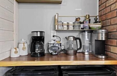 The gourmet kitchen is fully equipped for those who love to cook, complete with a dedicated coffee bar to start your mornings right.