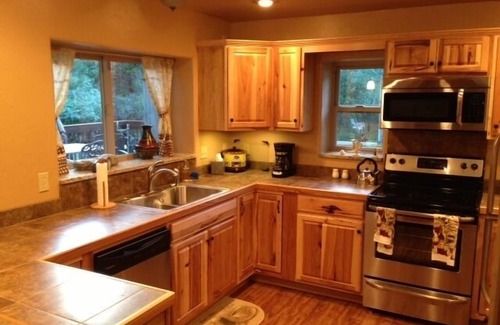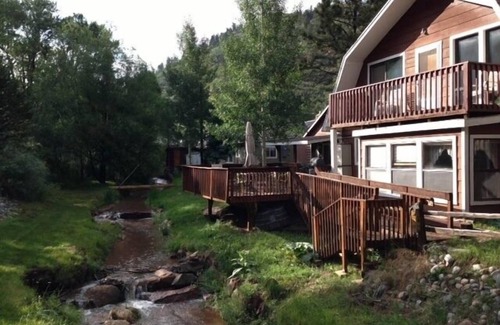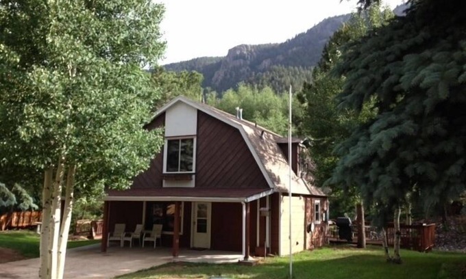 Quaint, 900 sq ft 2 story home with a loft. It sits right next to Fountain Creek; the sleepy year round stream that is fed by the snow melt from Pikes Peak. The new well-equipped kitchen and downstairs bath were just completed. Open the windows and you'll hear the sound of the stream. On the deck is a grill and large table that seats 8-10. Across our bridge is a beautiful shaded lawn picnic area.
