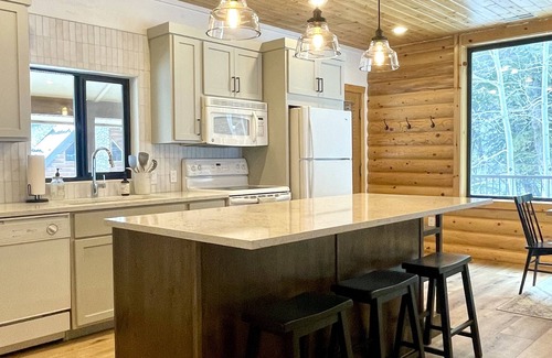 Our intimate 2 bedroom, 1 bath cabin with hot tub is perfectly sized for a couples retreat or family vacation to the Conde Nast award-winning resort. Bedroom 1 includes a king size bed and bedroom 2 a queen size bed. The living area is comfortable and spacious. The kitchen features quality appliances and granite countertops. Cooking ware, dishes, and utensils are also provided.