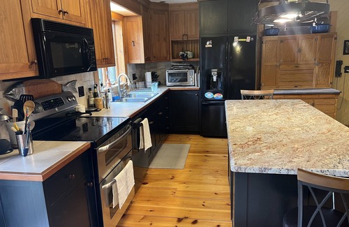 Lovely home with cook’s kitchen on two peaceful acres overlooking brook/waterfall. Relax on deck or large screened porch with bar, games and dining area. Grills, fire pit, outdoor seating, hammock & more.