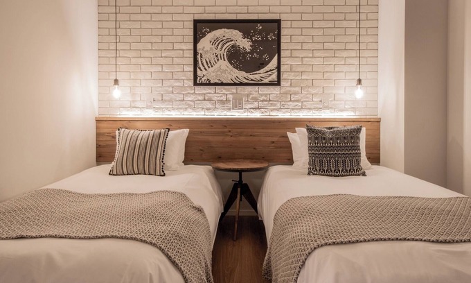 A resort twin room with an outdoor essence created in collaboration between fashionable outdoor brands snow peak and STARRY