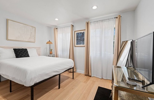 Master bedroom QUEEN bed. Guest bedroom FULL bed. TV w/ wifi for your streaming accounts in living room. Minimal basic cookware provided. Bring your own cooking oil and detergent. One parking spot next to home. Easy street parking for additional car.