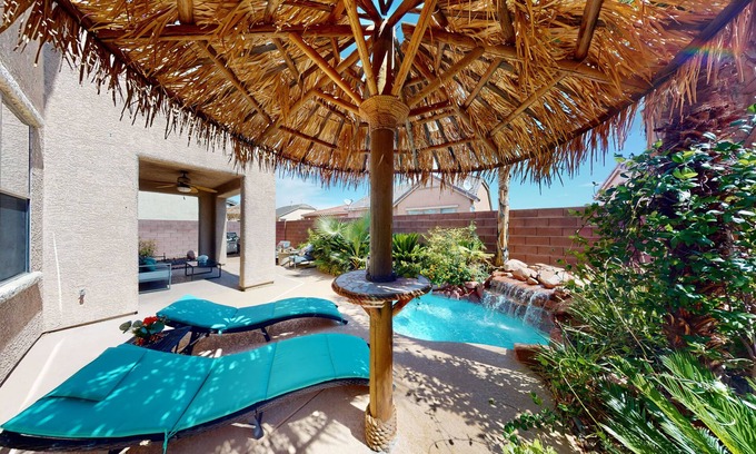 Located not too far from The Strip, yet not too close about 20 minutes, this beautifully appointed home features a Tropical Resort-like patio with thatched shade umbrellas, BBQ, gas fire pit, and jacuzzi tub and waterfall. Afternoon shade makes it the perfect place to relax or entertain.