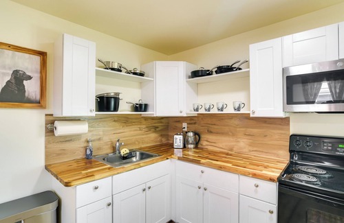 Prepare a home-cooked meal in the kitchen, stocked with an oven, a stovetop, and a microwave.