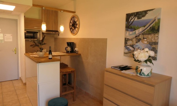 Fully furnished open kitchen, microwave, 2 electric plates, toaster, refrigerator, coffee-maker. 12 km from Cannes and « La Croiset-te »; only 15 minutes by car to the beautiful seaside; 2km from Grasse, the city of perfume and 28km from Nice and The Promenade des Anglais. Individual air-conditioning, 1st floor, furnished balcony with view over the golf Saint Daniel and the pool. Bathroom and toilet. +taxe 0.70€/person/night Beds : double sofa bed 140 cm. Parking: dedicated and secure parking n° 173 with personal digicode. Resort : controlled access with digicode. Bed linen and towels: not included Extras: Laundry: 4 € + Drying : 2 € (to pay at destination). Cleaning : not included. Free access to the swimming pool from 9 a.m. to 8 p.m. (from May to September). Ideal rental for the holiday period and that of the Cannes festival. Air-conditioned accommodation. Direct private rental. LINEN NOT PROVIDED - only 1 duvet, 1 mattress protective cover & 2 pillows with protective cover. Sheet kit + 2 towels: supplement €45. Household responsibility of tenants. Renovated in 2020 (kitchen) and 2022 (bathroom). New sofa. Private car park behind the building on the right (place numbered "APPT 118") Residence and secure outdoor parking with digicode. 2 minutes from the center of Mouans Sartoux and its shops. WIRELESS.