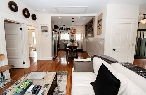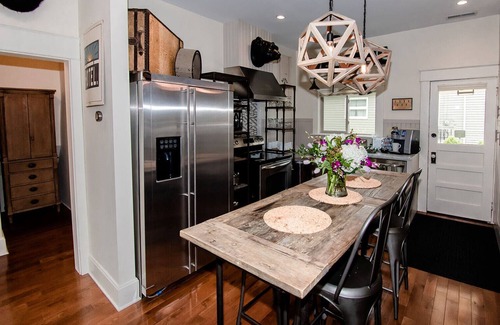 This thoughtfully designed retreat blends industrial-modern aesthetics with classic bungalow warmth. Inside, you'll find high-end Restoration Hardware furnishings, a fully equipped kitchen with modern appliances, and a dining area for four.