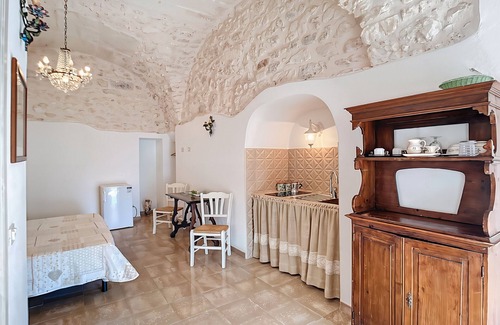 The apartment has been carefully renovated, keeping the stone vaults and original style intact. It consists of a spacious and bright room with double bed, equipped kitchenette, dining area and modern bathroom with large shower. The atmosphere is intimate and relaxing, perfect for couples and travelers seeking authenticity.