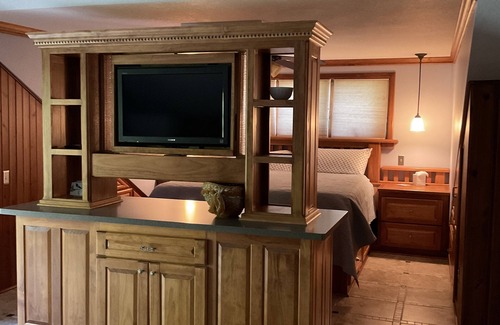 The studio has a separate entrance from the main house. It features a kitchenette, small balcony overlooking the backyard, shaded firepit, outdoor seating/dining, a well-appointed bathroom with tub, built in television with netflix, and air conditioner.