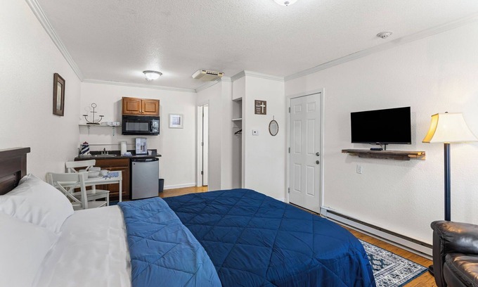 The property was originally built and functioned as a motel. Rooms were then renovated and turned into individual apartments. This particular apartment is a studio room with a queen-size bed, dining area, kitchenette, closet, and bathroom with a shower. There is a door that leads to the next room, but it is locked on both sides. The parking area and front door entrance has good lighting. The distance from where you park to where you stay is just a few feet away, and there are no stairs to go up, so it is very accessible. If you have things that need washed, there is a laundromat just a couple blocks away. If you are wanting somewhere to dine, there are several nearby restaurants, including a really good Mexican restaurant across the street.