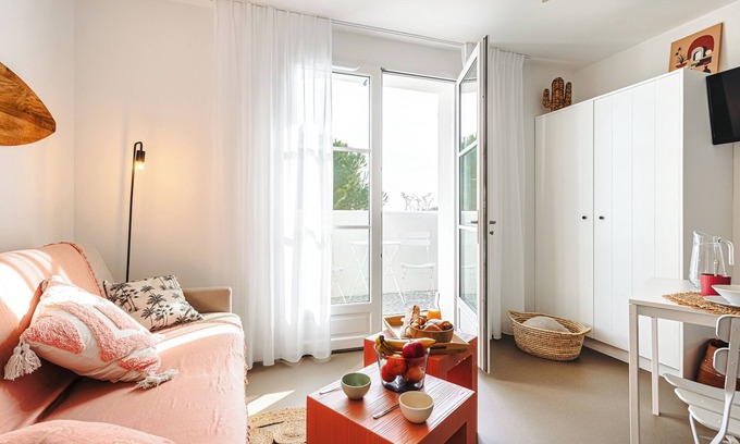 This 22m² studio for 2 people, located on the 1st floor, has a bright living room with a sofa bed (160 X200 cm) and all the facilities you need for your comfort. There is also a fully-equipped kitchen area (dishwasher, coffee machine, induction hob, microwave, etc.) and a modern shower room with WC.