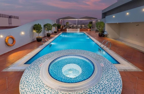 The elegant apartment offers modern accommodation, 15 minutes by foot from BurJuman Mall. Luxurious amenities include an outdoor pool with sun loungers and a fitness centre.