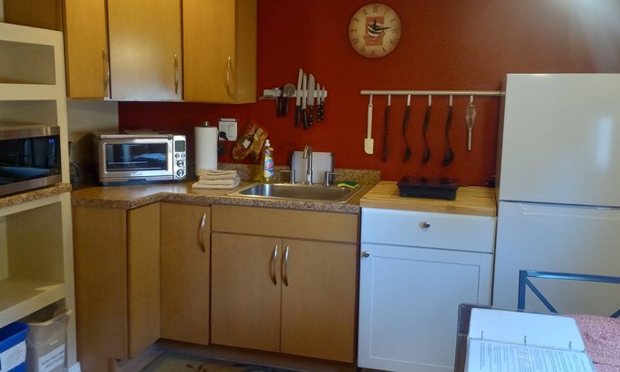 Cozy, well-furnished non-smoking apartment adjacent to private home with private entrance. Hulu Live which provides Movies & Cable TV shows 'on-demand' and includes access to local networks. Small kitchen, living area and 3/4 bath with tiled 36'' shower. Amenities include wireless internet, flat-screen TVs in sitting area and bedroom, breakfast table, refrigerator, microwave, toaster-oven, coffee pot, dishes, glassware, silverware, cooking utensils, queen bed, and closet. Body wash, shampoo, conditioner, hair dryer and iron provided. Washer & Dryer on site (not shared). All linens included. Private entry with security door. Keyless entry allows for late check in if desired. Check-in after 4:00 pm, check-out before 11:00 am unless previously arranged. Quiet, safe neighborhood and great for taking walks. Senior Center is within walking distance. Two miles from ASU, Mill Ave, Town Lake, and Light Rail. Located in quiet residential neighborhood, walking distance to Starbucks, city bus stop, churches, grocery, library, restaurants, and Walmart. 12 minutes from airport.