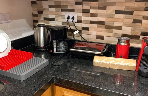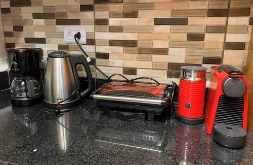 The kitchen is equipped with an oven, a stovetop, and a refrigerator, as well as a coffee maker, an electric kettle, and a microwave. Bathroom amenities include a hair dryer, towels, and toilet paper. And because there's access to laundry facilities, you can go a bit lighter on your packing. Other amenities include bed sheets and air conditioning.