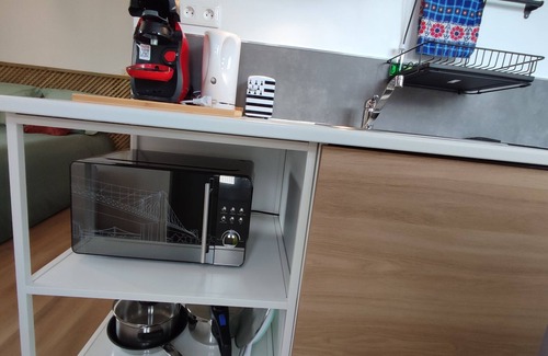 The kitchenette is equipped with a stovetop and a refrigerator, as well as a coffee maker, an electric kettle, and a microwave. Bathroom amenities include a hair dryer, towels, and toilet paper. And there is a laundromat nearby so you can pack a bit lighter. Other amenities include bed sheets and heating.
