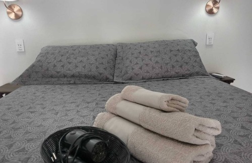 This 1-bedroom, 1-bathroom rental features air conditioning and a desk. Bathroom amenities include a hair dryer, towels, and toilet paper. The kitchen is equipped with a refrigerator, as well as a coffee maker, an electric kettle, and a microwave.
