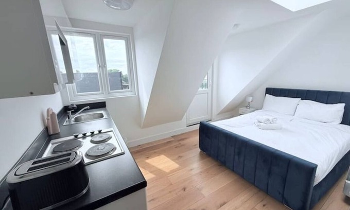 Flat 9 is a modern and cozy studio located on the third floor of Golders Green Road. It features a comfortable sleeping area, a sleek private bathroom, and a compact kitchenette equipped with a stove, fridge, microwave, kettle, and all the essential cookware. Ideal for solo travelers or couples, this quiet and functional space offers a convenient base just a short walk from Golders Green Station, shops, and cafés. Enjoy a simple, comfortable stay with easy access to central London.