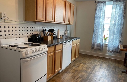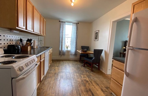 Spacious studio apartment located in historic downtown Hannibal, Missouri. Historic apartment with hardwood floors, high ceilings and all the amenities of home. Walking distance to historic Main Street, shopping, museums, arts, restaurants, and parks. This studio apartment comes fully furnished with full service kitchen and spacious bedroom/living area with king size bed, desk, television, Roku. and seating. Personal heating and cooling unit with remote control dialing and free WiFi. All utilities are included. The perfect home away from home for traveling professionals and nurses. Hannibal Regional Hospital and medical campus is a short drive away and Quincy Medical facilities are 25 minutes away. Explore Sodalis Naturę Trail just a few blocks away, visit the Mark Twain Museum, take a ghost tour, or experience one of our many festivals. Apartment has double key entry for security and free ample parking located behind building. Free shared laundry facilities.