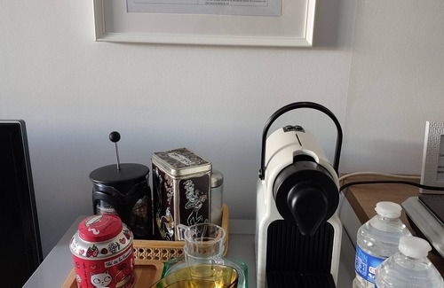 This vacation rental features air conditioning and a desk. Bathroom amenities include a hair dryer, towels, and toilet paper. The kitchenette is equipped with a stovetop and a refrigerator, as well as a coffee maker, an electric kettle, and a lobster pot.
