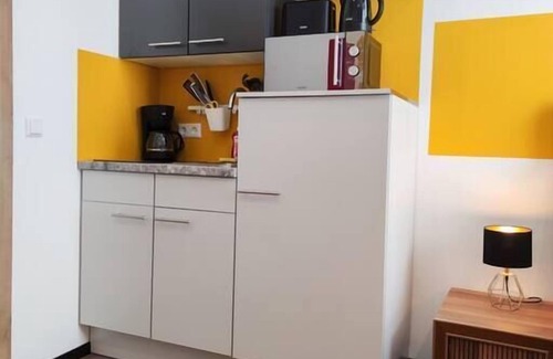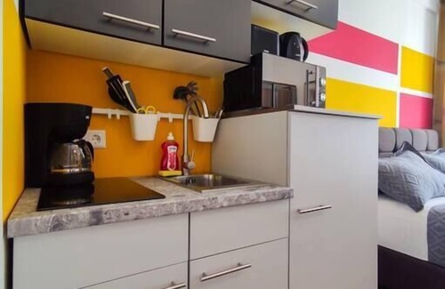 You will find a delicately designed space in the apartment where yellow, red and white add an eye-catching look. You will also have a useful and spacious wardrobe in this area, which is illuminated by a window. When you want to prepare a nice breakfast or dinner, the kitchenette with all kinds of kitchen utensils, especially the refrigerator, microwave, coffee maker, and the dining table for two will always be a few steps away from you. And the modern, delicately designed bathroom is the ideal place to start a great day or unwind. Moreover, thanks to the Hadersdorf/Kamp Bahnhof train station right next to you, it will be your privilege to reach Vienna whenever you want and quickly.